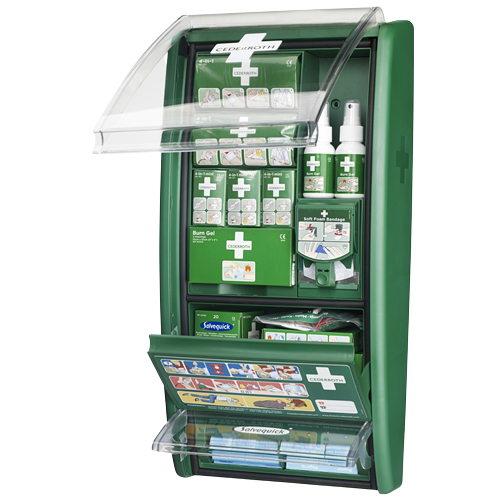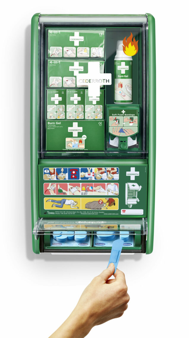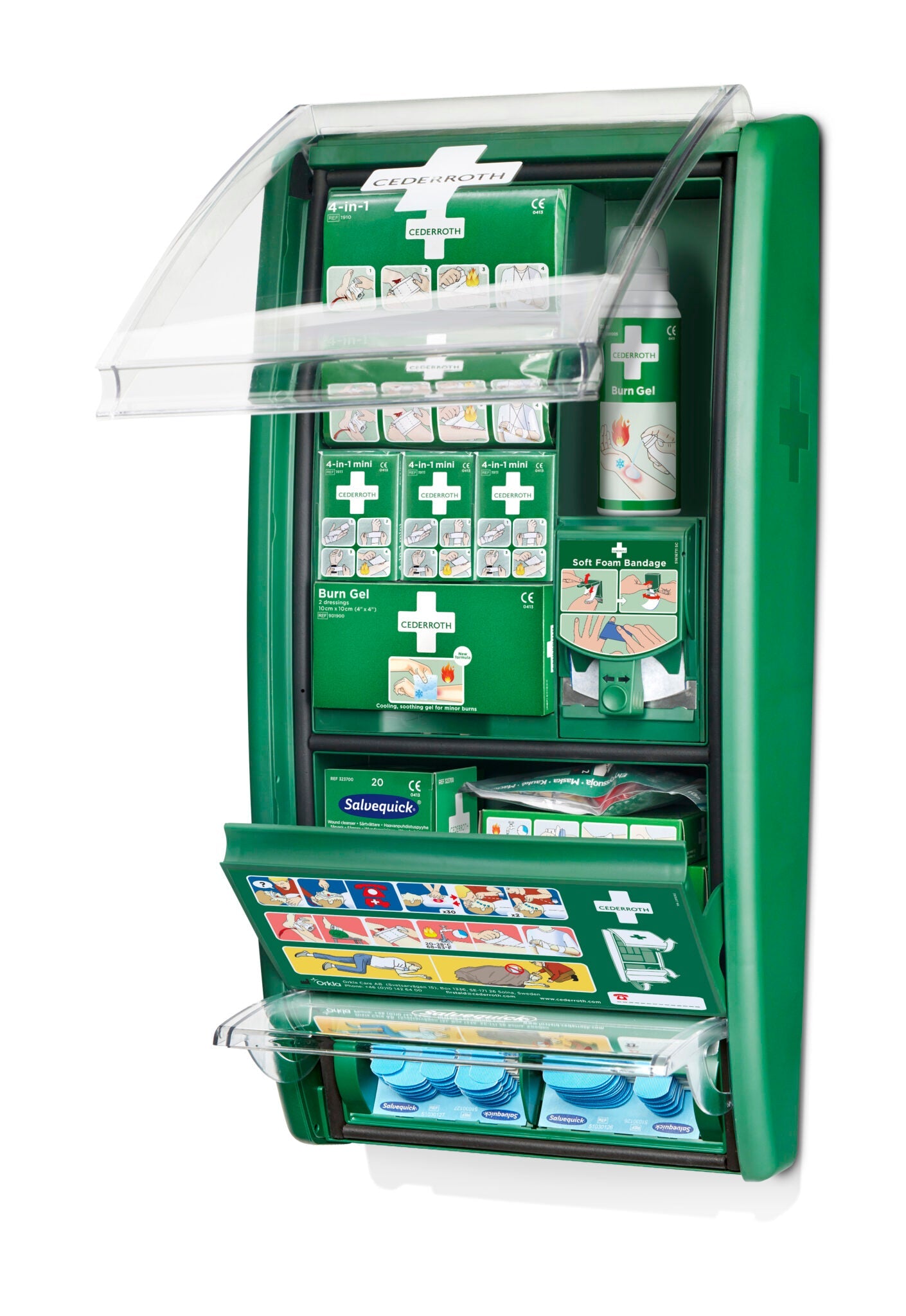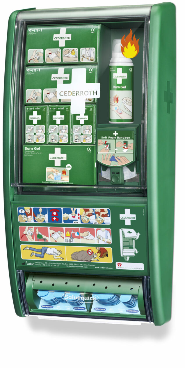 Cederroth Førstehjælps- og Brandsårsstation giver dig alt, hvad du behøver til at håndtere brandsår og snitsår på arbejdspladsen. Dette professionelle basissæt leveres i et praktisk skab, klar til ophængning, og inkluderer produkter med tydelige instruktioner, herunder Cederroth Burn Gel Dressing og Cederroth Burn Gel, der hurtigt lindrer smerter og køler ved brandsår. Desuden medfølger Cederroth Burn Cover sårpuder med kølig hydrogel til mindre brandsår, snitsår og hudafskrabninger. Stationen indeholder også det effektive elastiske plaster Cederroth Soft Foam Bandage Blue, der forbliver siddende, selv ved kontakt med vand. Med en nøgle til genopfyldning, førstehjælpsvejledning og en førstehjælpsmaske er denne station en komplet og nem løsning til akut førstehjælp.